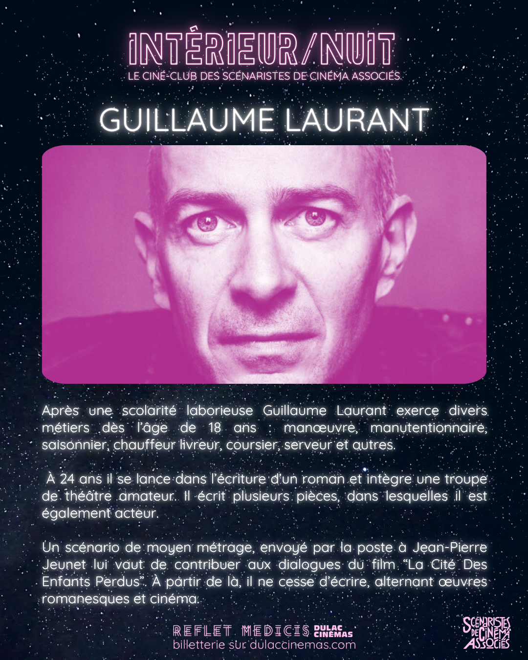 La projection sera suivie d'une discussion avec Guillaume Laurant, animée par la scénariste réalisatrice Lucie Le Carrer et le scénariste réalisateur Jonathan Comnène, également membres du SCA.