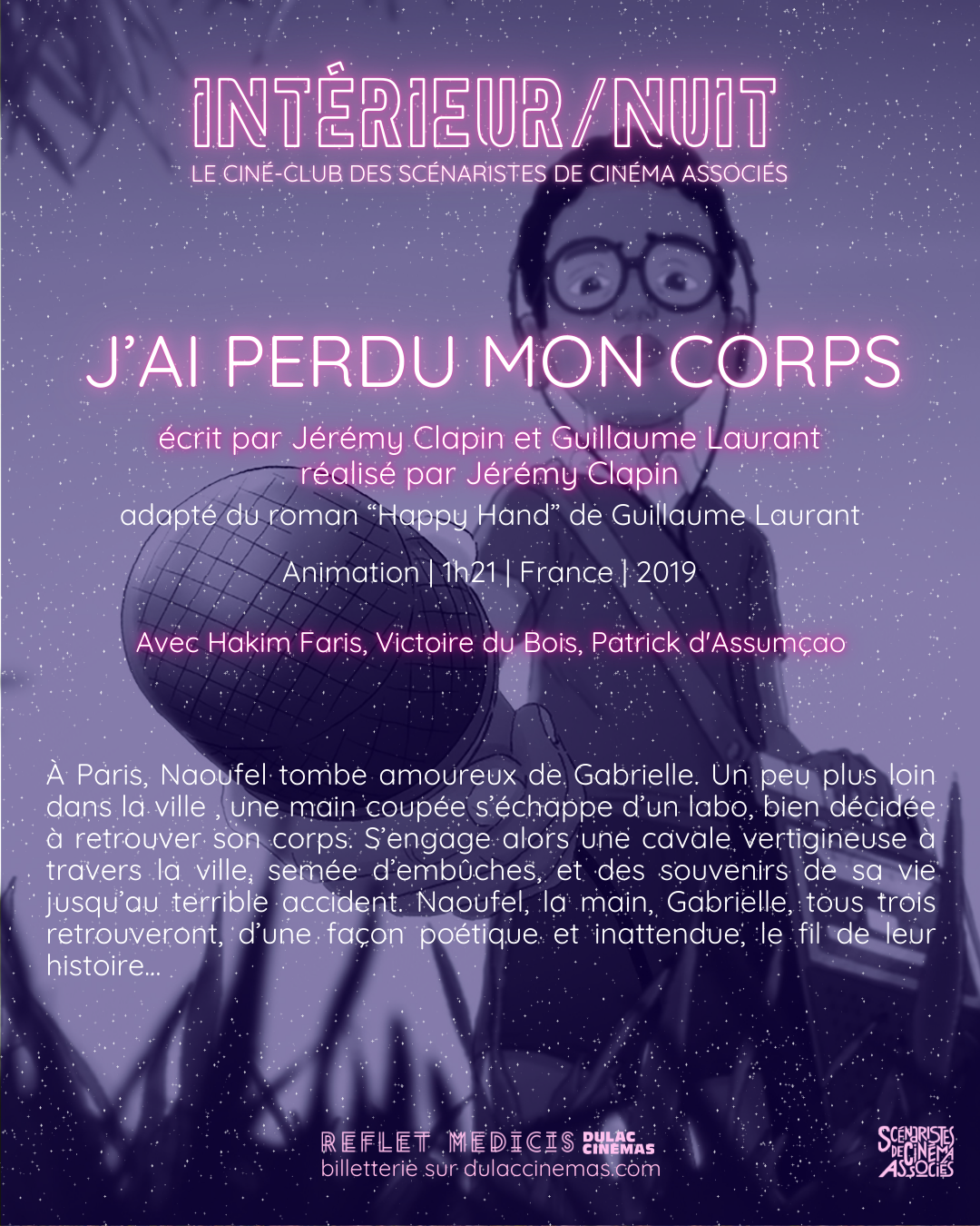 La prochaine séance du ciné-club du SCA sera consacrée au film d'animation J'ai perdu mon corps, réalisé par Jérémy Clapin, co-écrit avec Guillaume Laurant, membre du SCA. Il s'agit d'une adaptation du roman Happy Hand de Guillaume Laurant.