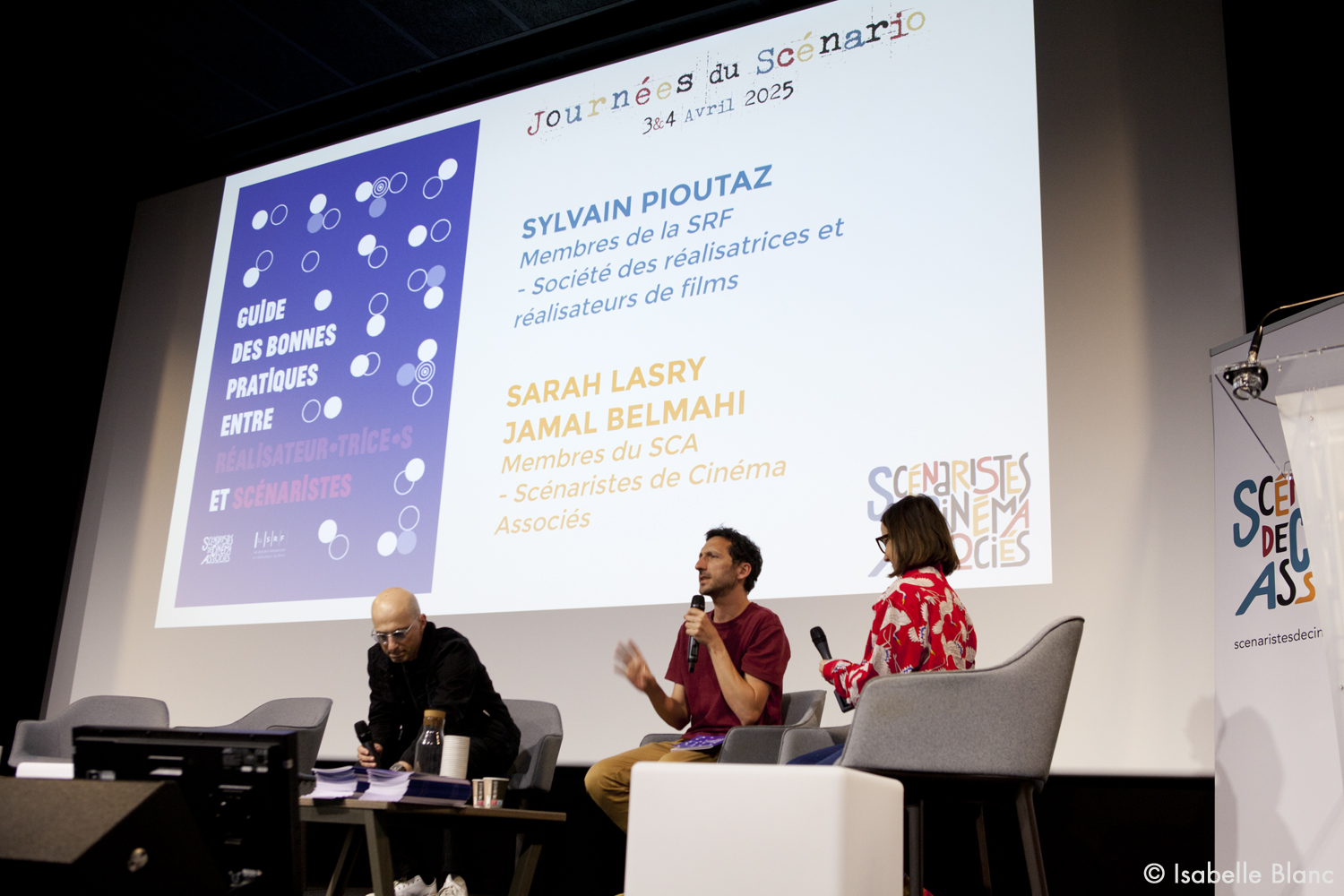 Lancement du Guide des bonnes pratiques entre réalisateur·trices et scénaristes, rédigé par le SCA et la SRF, présenté Sarah LASRY et Jamal BELMAHI membres du SCA, et Sylvain PIOUTAZ membre de la SRF - Société des réalisatrices et réalisateurs de films.